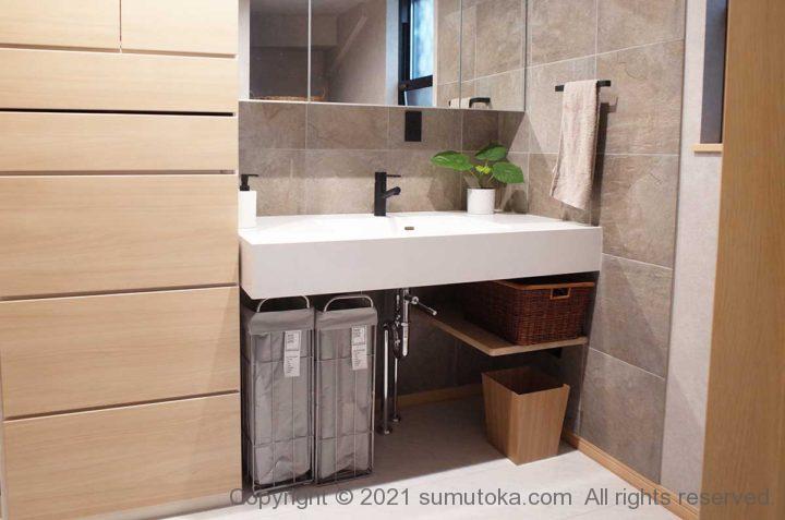 洗面カウンター下がオープンタイプの洗面台を選んだため、建築時に棚板を右側に一枚取り付けてもらいました。この棚上にはカゴを置いてドライヤーやヘアアイロンを収納しています。その下にはゴミ箱をセット。左側は楽天で購入したランドリーボックスを2つ置き、アイロンをかけるものを入れるほか、クリーニングに出すものの一時置きにしています。