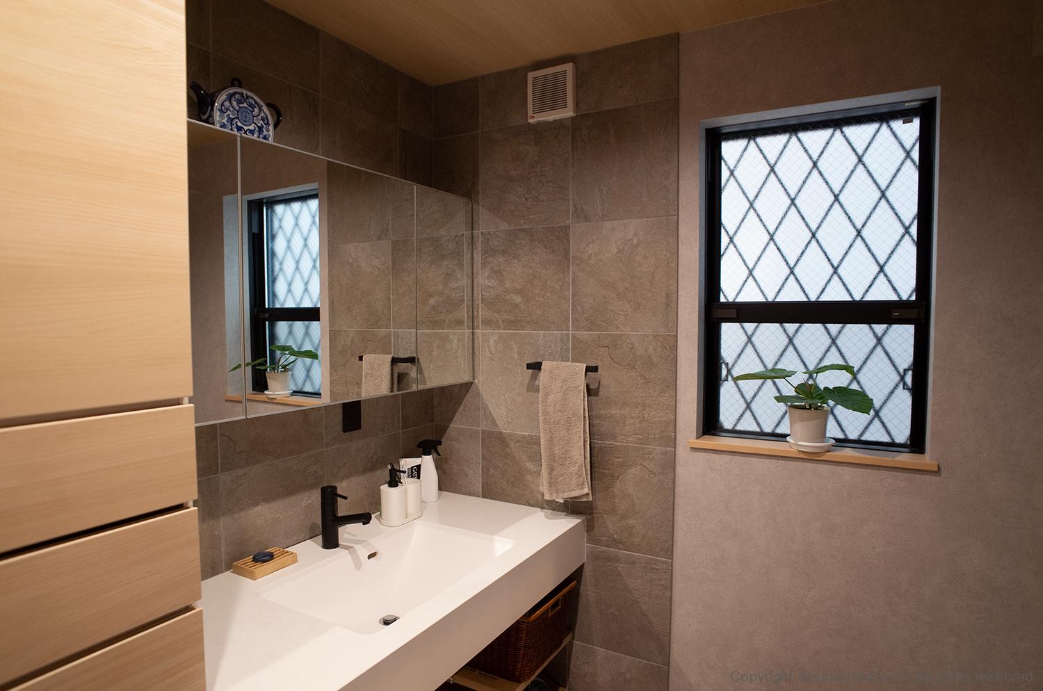 洗面台まわりはタイルを含めて、サンワカンパニーを施主支給しています