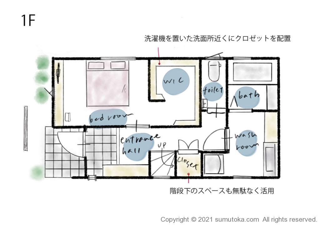 これが1階の間取りです。3階建ての狭小住宅の場合、トイレは2箇所に設けることが多いようですが我が家は1階のみ。理由はお腹が弱い夫が気兼ねなくトイレにこもれるよう、リビングダイニングから離したかったことと、歳をとって夜中のトイレが増えたときのことを考えて寝室の近くに作りました。