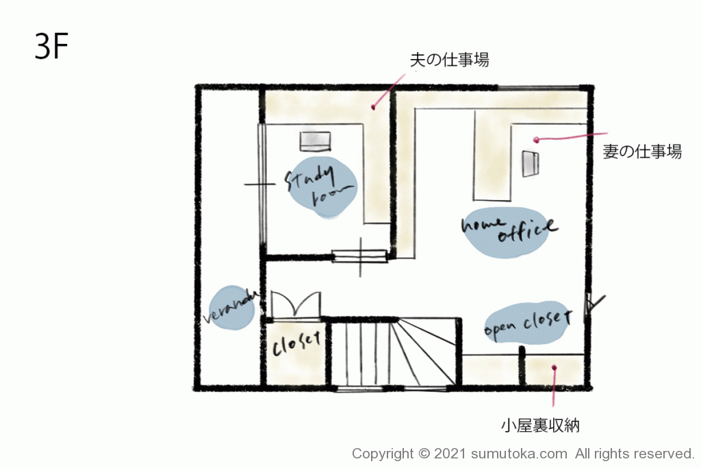 3階は夫婦の仕事場になります。それぞれに取引先との守秘義務もあり、WEB会議や電話の内容が聞こえないよう別々のスペースとして独立させています。夫の書斎は2.6帖と独房のような広さですが、これは「狭いところが落ち着く」という本人の希望によるもの。また、新型コロナが沈静化した後もテレワークを継続するとはいえ、出社することもゼロではなく。そのため、最低限のミニマムサイズになりました。