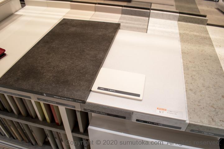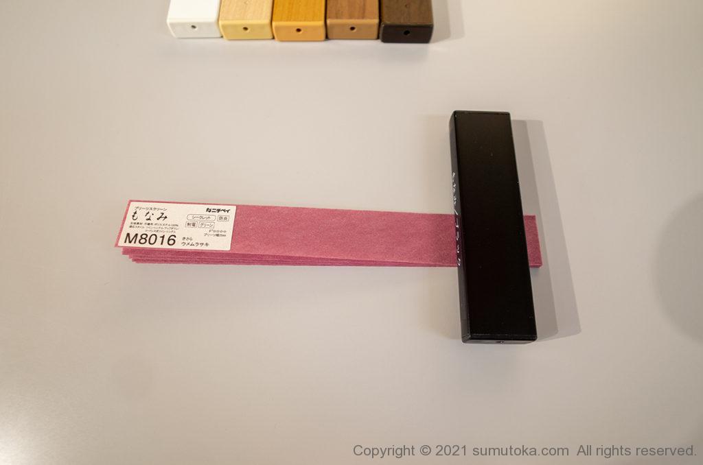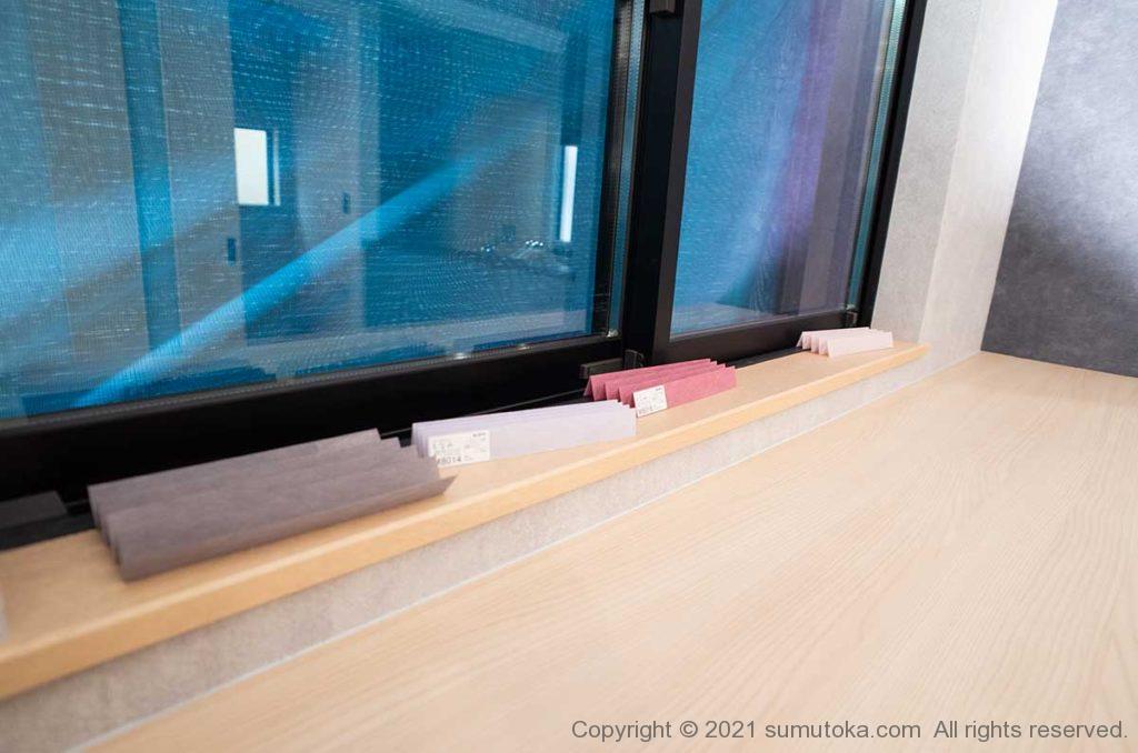 ヘッドボックスとボトムレールのサンプルはありませんが、窓枠が木目ピュアナチュラルと同色。ここに置いて色味を確認することにしました。かわいいのはウメムラサキですが、右側にあるキッチン(墨黒)や床色(グレー)と合わせるならハイチャやウスネズでしょうか。壁紙もグレーなので重たすぎるかも…と思い、居合わせた現場監督にも見立ててもらうことに。ソファがモスグリーンなので「色数が増えるよりも薄いピンクグレーのサクラネズが無難では?」とアドバイスがあり。 前述のとおりサクラネズでオーダーしました。