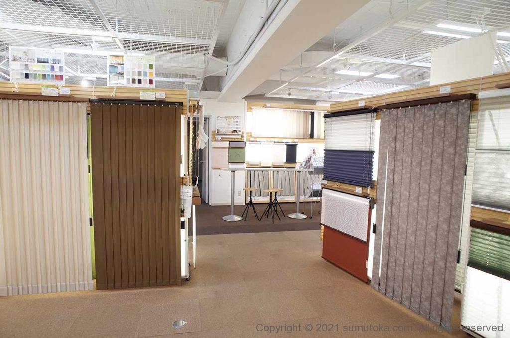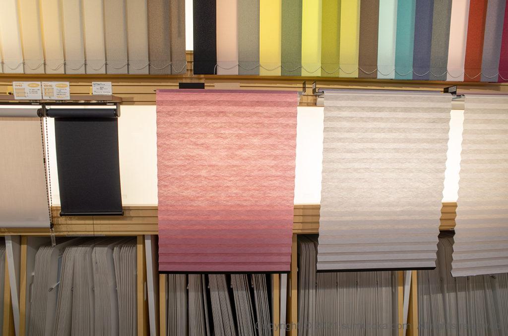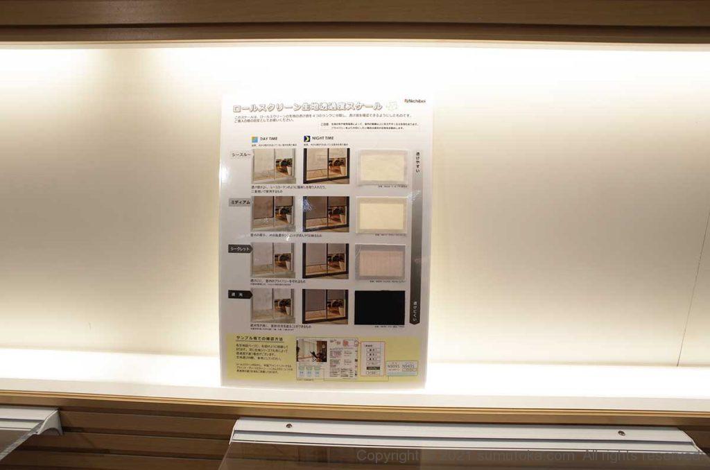 ニチベイが扱うスクリーンがずらりと展示してあるショールーム。おめあての「もなみ」シリーズもありましたが、これだけ種類があると目移りしてしまいます。
