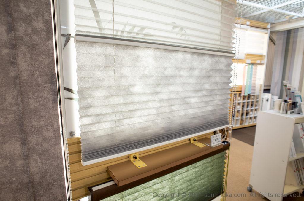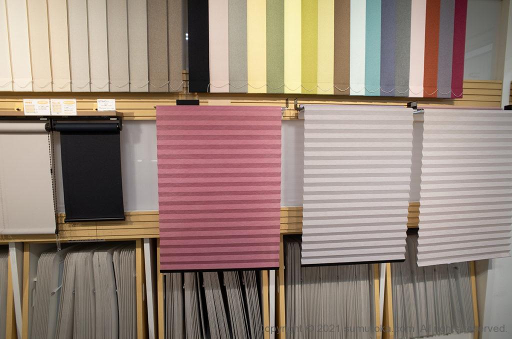 とはいえウメムラサキに惚れ込んでしまっているので「ヘッドボックスとボトムレールを内装に合わせて変えればなんとかなるかな?」と悪あがき。プリーツスクリーンのサンプルを試してみることにしました。ショールームでは選んだ色を壁掛けして、窓に設置した場合の色の変化や光の透け具合などを見ることができます。