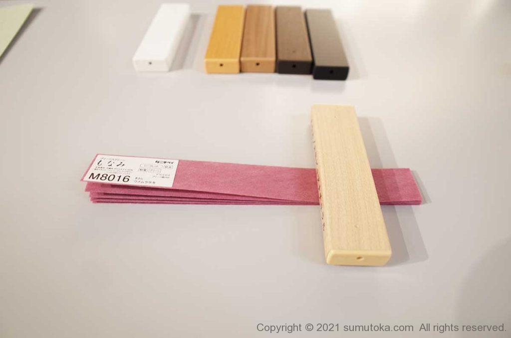 ショールームでは決めきれなかったので、スクリーンのサンプルをもらって帰ることに。ヘッドボックスとボトムレールは家のインテリアから木目ピュアナチュラル(左から2番目)に決定。