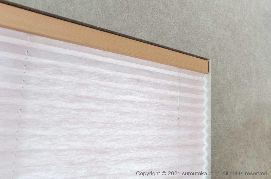 そこでインテリアに馴染む和紙調のプリーツスクリーンを設置することに決めました。写真は楽天で調べて、見つけたのがニチベイというメーカーの「もなみ」シリーズを設置した状態。色はスクリーンの色はサクラネズ、ヘッドボックスとボトムレールは木目ピュアナチュラルの組み合わせています。障子窓と同じく、光をやわらかく通してくれるので閉め切っていても明るく、和紙の質感もとても気に入っています。