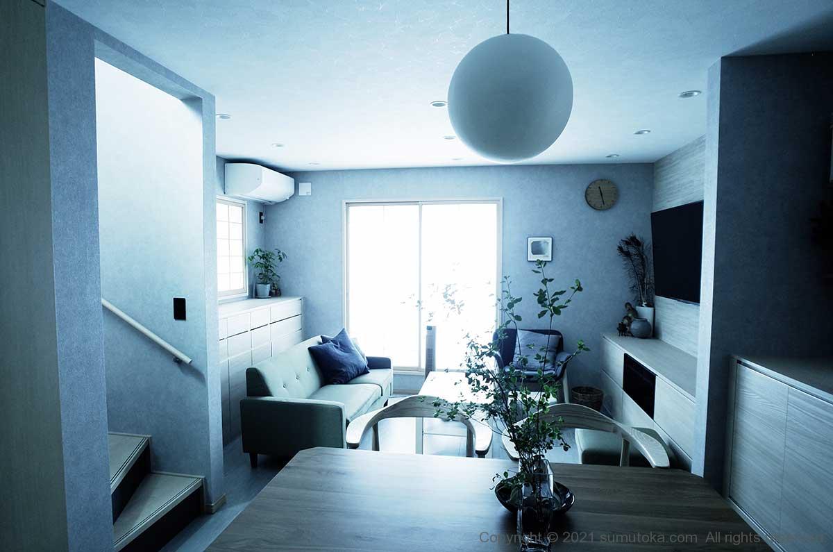 この写真は昼間のダイニングで撮ったもの。窓はすべて閉め切っている状態でダウンライトはつけていません。和紙がやわらかく光を通すから、室内を眩しく感じることなく適度に照らしてくれます。