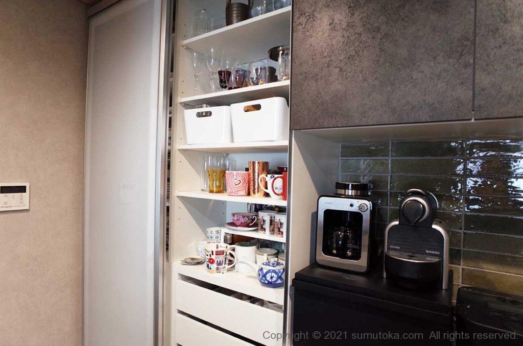 食器や調理器具、家電などを収納するため、背面にもキャビネットを入れています。統一感があったほうが見た目もいいし、使い勝手もよいと思い。同じステディアシリーズで採用しました。