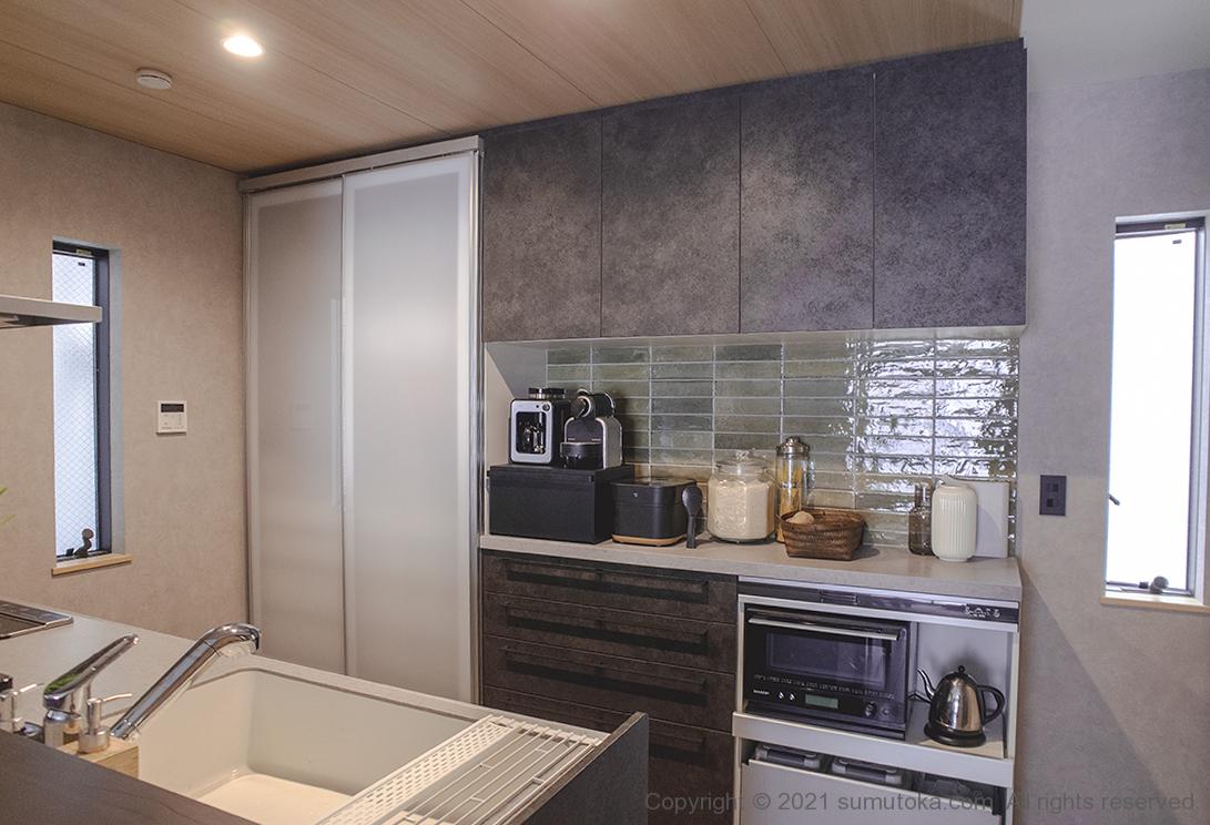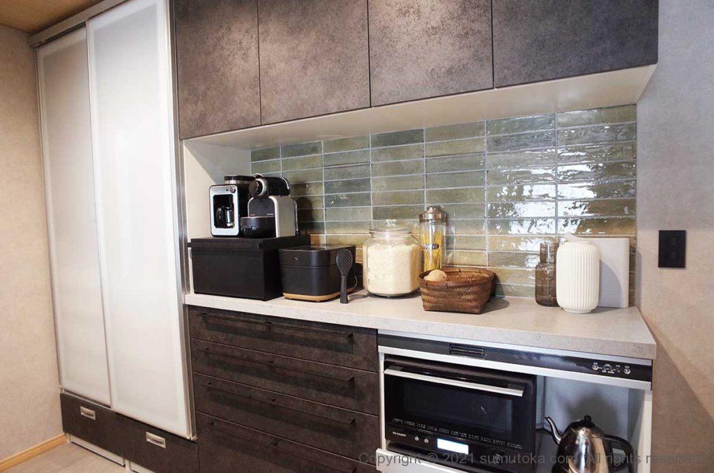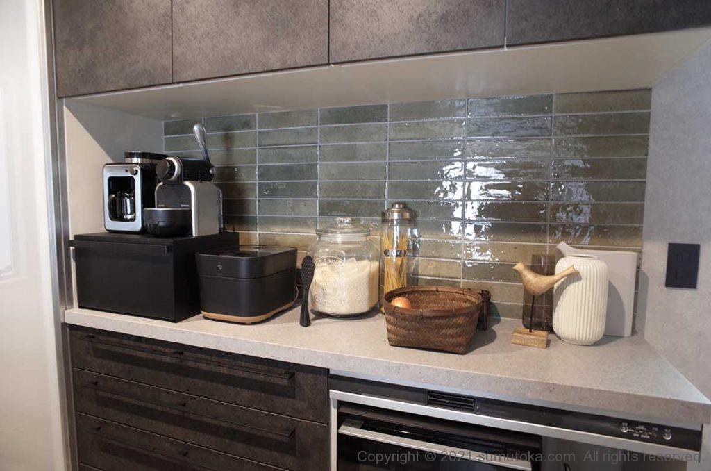 キッチンカウンターはワークトップと同じカリーザグレーです。壁には名古屋モザイクタイルのクロジョーロを採用しています。目地色にもこだわったお気に入りの場所です。