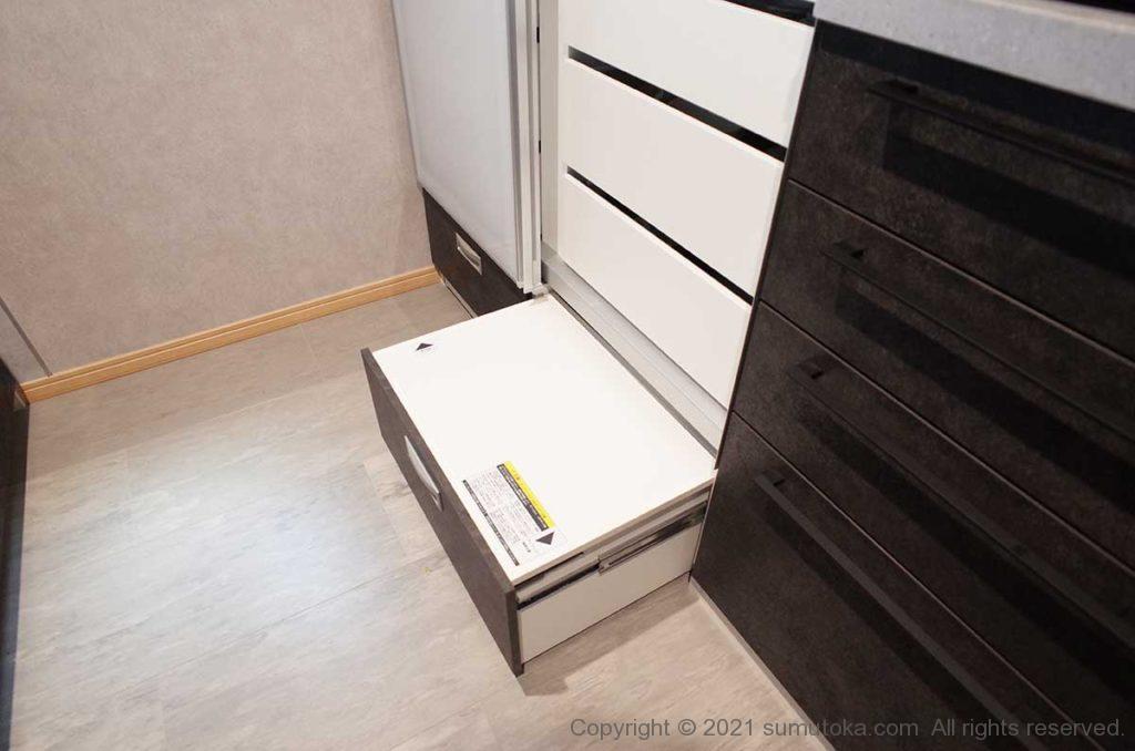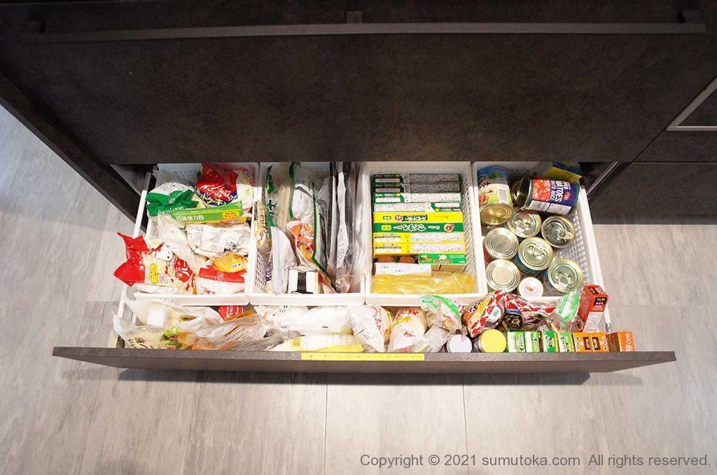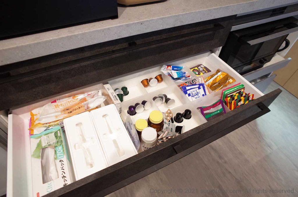 シンクとコンロの下に付随する収納スペースです。これもショールームでアクセサリーパーツを選んで、キッチン仕様を決める際に併せて発注しました。