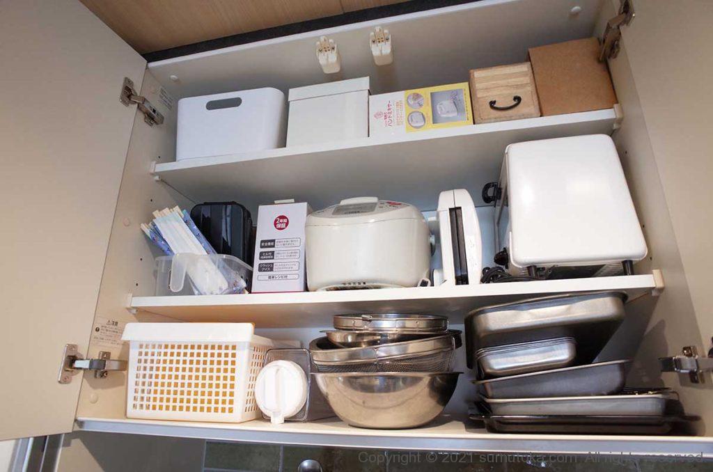 吊戸棚には普段は使わないサブの炊飯器やトースター、ミキサーといった調理家電のほか、調理器具、製菓材料、お弁当用具を収納。下段にはなかでも日常的に使うボウルやトレーなどを入れて取り出しやすくしています。