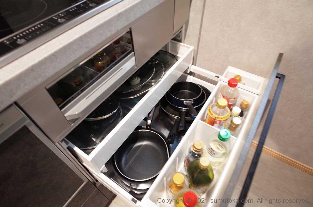 さらに下にも引き出しがついています。屈んで開け締めする位置なので、普段は使わない土鍋や卵焼きフライパンなどをここへ収納しています。