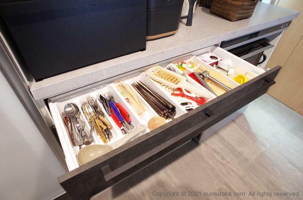 引き出しには純正のトレーを2つ買って入れました。カトラリーのほか、サッと取り出しやすい位置でもあるので調理につかうピーラー、落し蓋、にんにくマッシャーなどを収納しています。