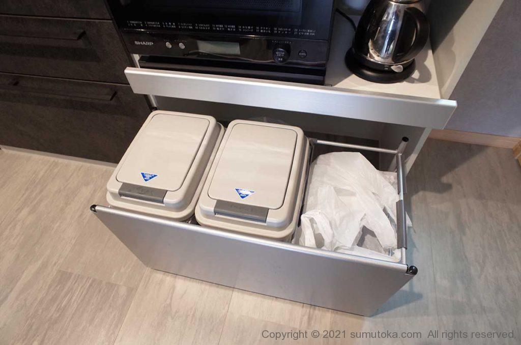 最下段にはゴミ箱が3つ乗る引き出しがついています。生ゴミ、缶ゴミを箱に入れて、右側はあえて箱を入れずにペットボトルや瓶、トレイをビニール袋に入れてまとめています。