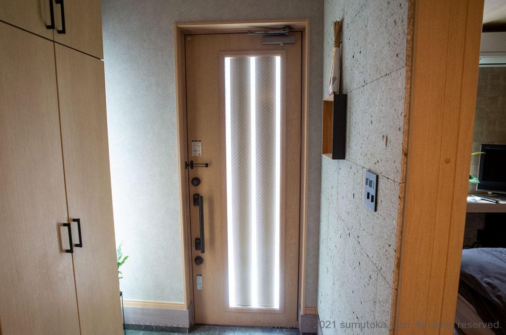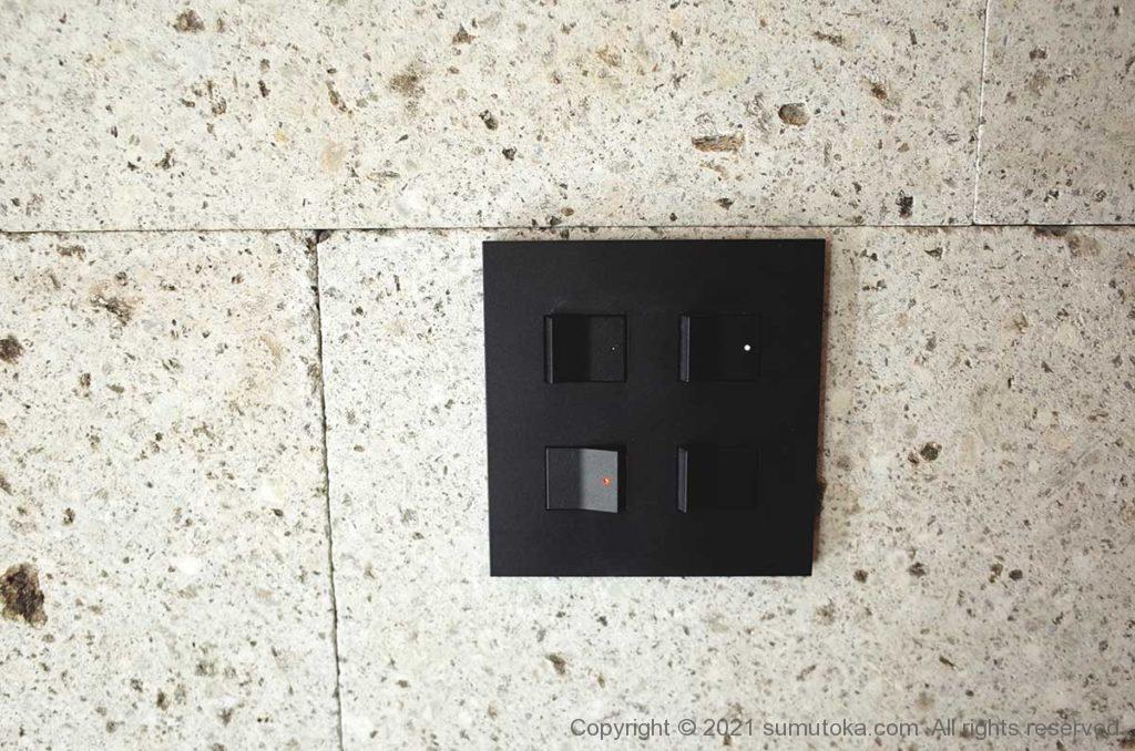 玄関は廊下と外の照明とで4つのスイッチがあります。4つとも照明がオフのときにランプがつく”ほたるスイッチ”ですが、小さく点灯するミニマルデザイン。壁の大谷石とあわせてもうるさくならず、インテリアもぐっとモダンに仕上がりました。